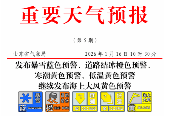 山东省气象台于1月16日10时30分发布暴雪蓝色预警、道路结冰橙色预警、寒潮黄色预警、低温黄色预警,继续发布海上大风黄色预警。