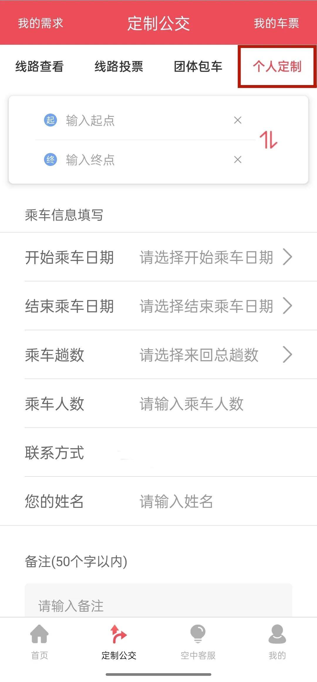 ③通过“定制公交”板块中的“个人定制”功能,填写您的出行意向(比如从哪出发、大致出行时间等)就可以啦!