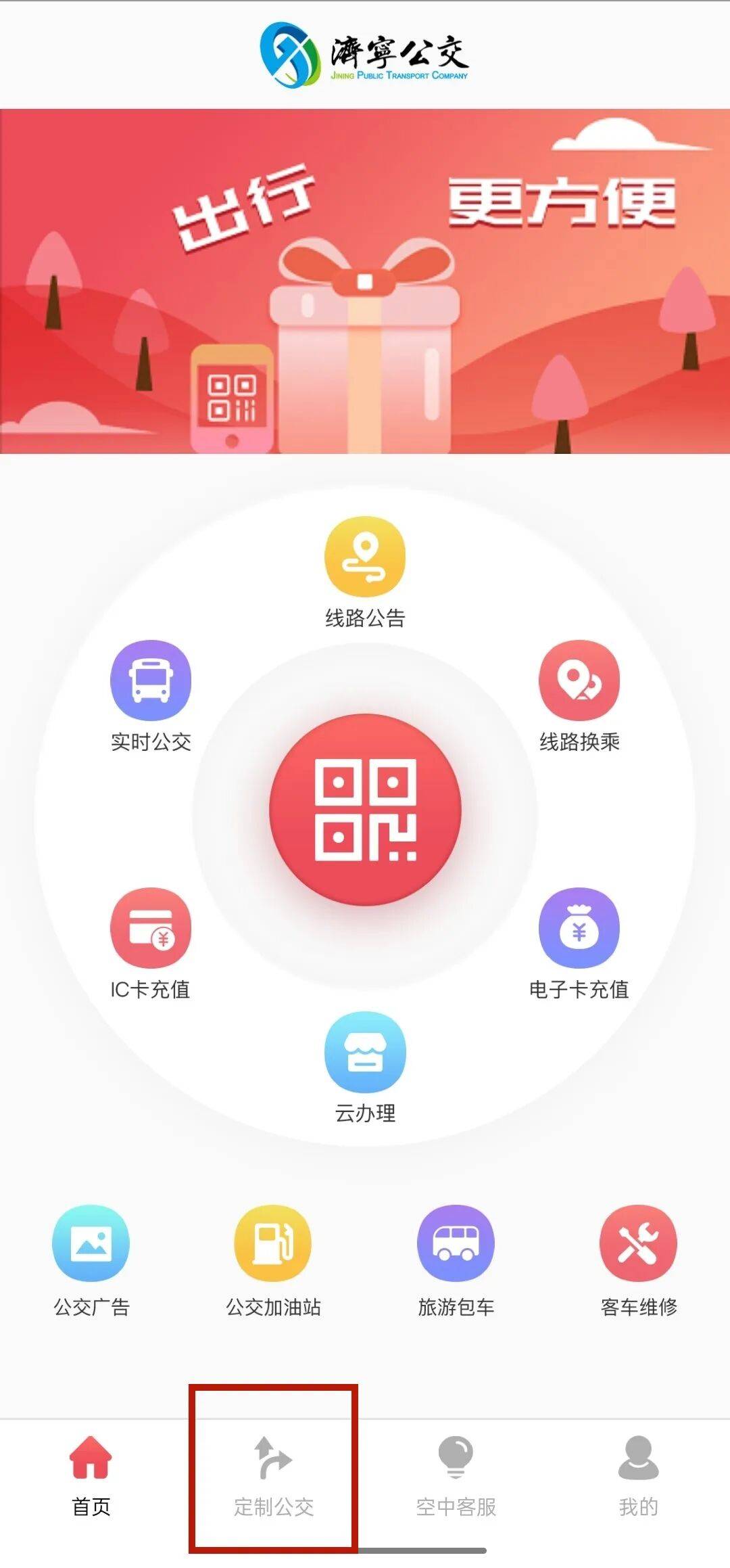 ②点击APP首页的“定制公交”板块。