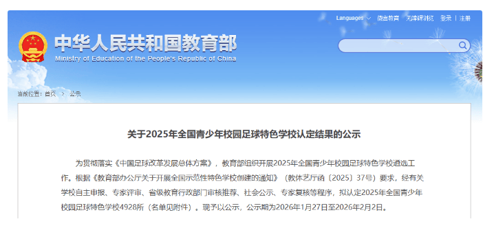 为贯彻落实《中国足球改革发展总体方案》,教育部组织开展2025年全国青少年校园足球特色学校遴选工作。根据《教育部办公厅关于开展全国示范性特色学校创建的通知》(教体艺厅函〔2025〕37号)要求,经有关学校自主申报、专家评审、省级教育行政部门审核推荐、社会公示、专家复核等程序,拟认定2025年全国青少年校园足球特色学校4928所(名单见附件)。现予以公示,公示期为2026年1月27日至2026年2月2日。