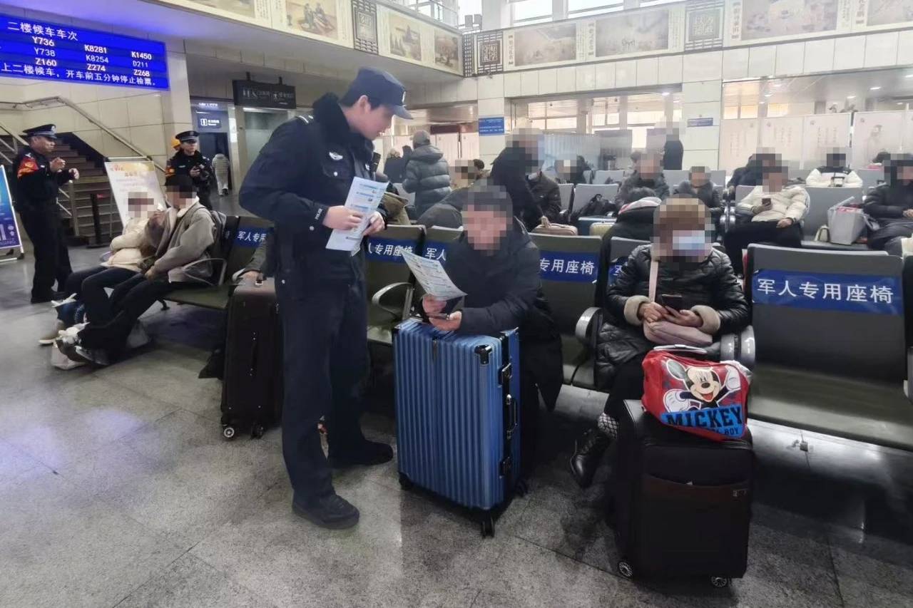 近日,济宁市公安局兖州分局利用春节前群众集中返乡的节点,在兖州火车站候车大厅开展反电诈和网络安全联合宣传活动。