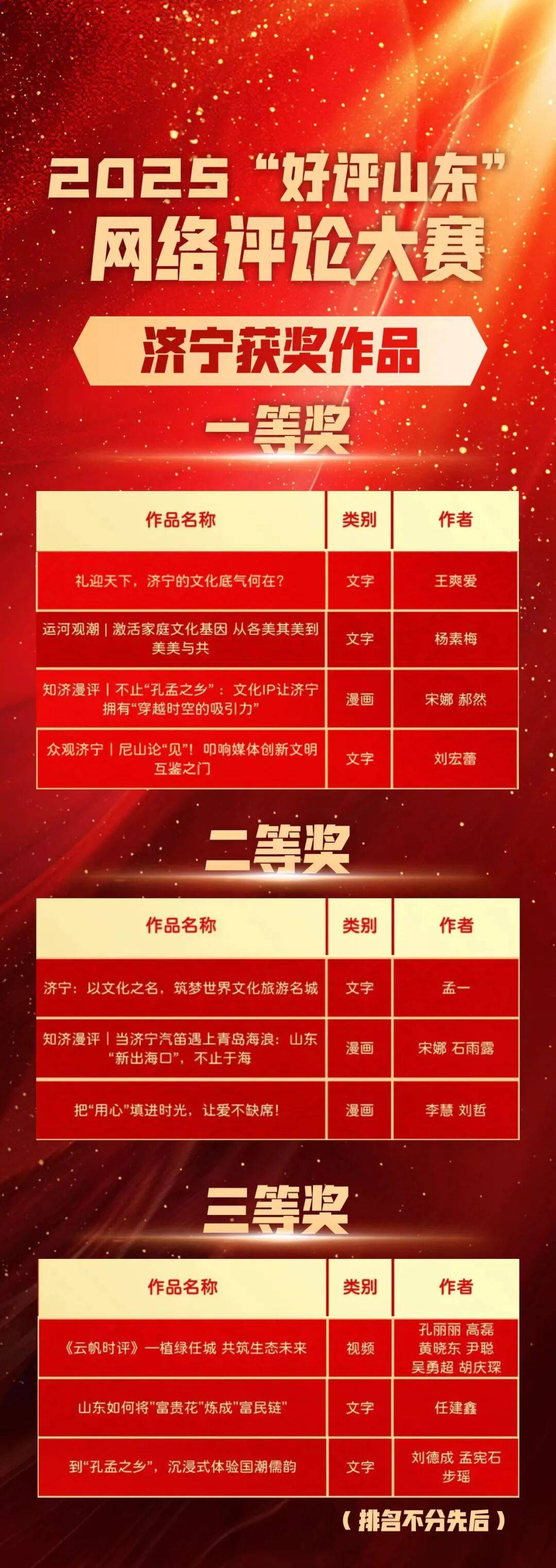 济宁市4件作品获一等奖,3件作品获二等奖,3件作品获三等奖。名单如下: