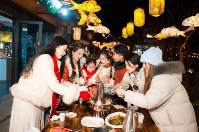 鲁源村全新打造网红银丝古建——浮光琉璃台,在灯光的照射下琼楼玉宇流光溢彩成为景区打卡热点,新春社火表演再现春节民俗,长桌宴凝聚节日氛围温暖游客旅途。