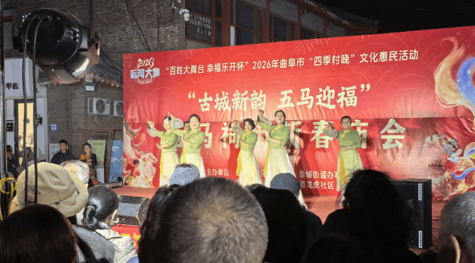 五马祠街“古城新韵 五马迎福”新春庙会在丰富美食娱乐体验的同时,开展了“百姓大舞台 幸福乐开怀”2026年曲阜市“四季村晚”文化惠民活动。