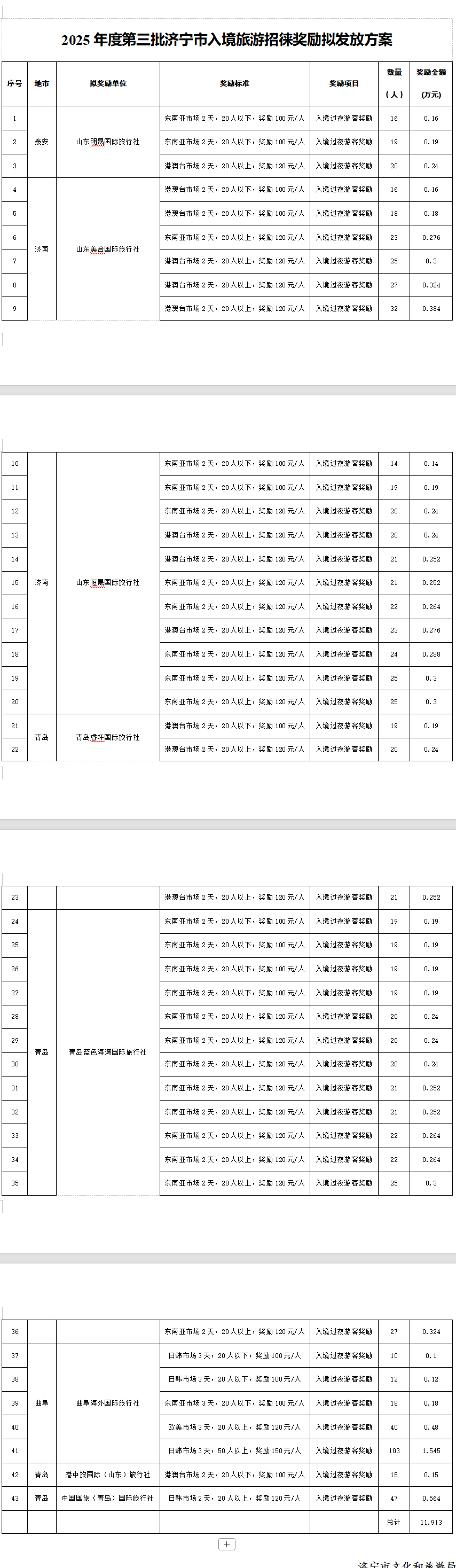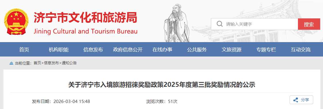 3月4日,济宁市文化和旅游局发布关于济宁市入境旅游招徕奖励政策2025年度第三批奖励情况的公示,根据济宁市文化和旅游局《2025年济宁市入境旅游招徕奖励工作方案》,2025年对通过旅游包机、团队游等组织境外游客来济宁开展团建、研学、旅游观光、休闲度假等活动的具有合法资质的旅行社进行奖励。经申报、审核等程序,并经济宁市文化和旅游局党组会议研究,拟对2025年10月底至11月30日,符合奖励条件的旅行社发放第三批奖励资金。