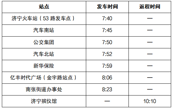 (三)停靠站点:济宁火车站(53路发车点)、汽车南站、公交集团、汽车北站、新华保险、亿丰时代广场、南张街道办事处、济宁殡仪馆(新馆)
