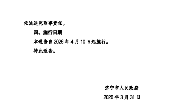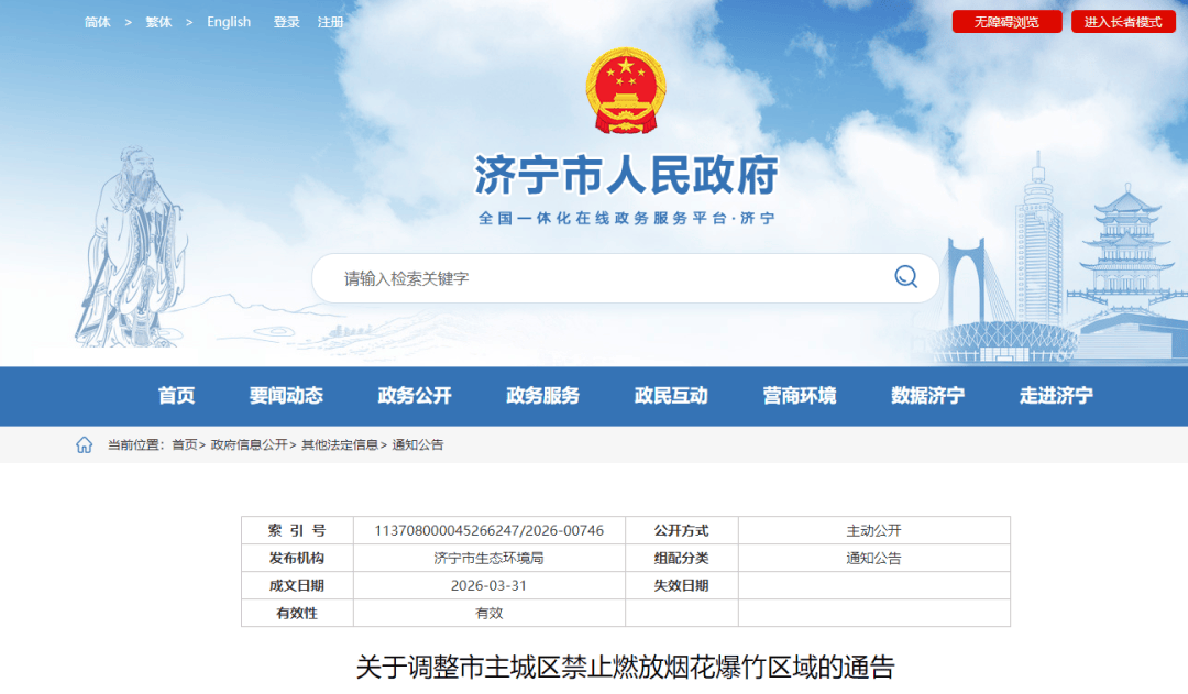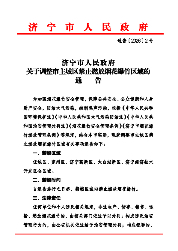 日前,济宁市人民政府发布关于调整市主城区禁止燃放烟花爆竹区域的通告,4月10日起,任城区、兖州区、济宁高新区、太白湖新区、济宁经济技术 开发区全区域禁止燃放烟花爆竹。
