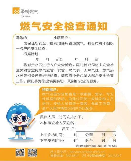具体安检时间以安检员张贴“单元安检通知”为准,请留意安检人员联系电话进行预约服务,为确保用气安全请您配合兖州华润燃气工作人员进行入户安全检查 !