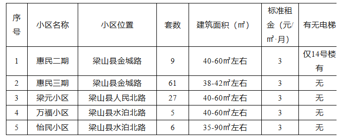 1、梁山县公共租赁住房租金标准按照梁山县发展和改革局《关于梁山县公共租赁住房租金标准的批复》(梁发改〔2025〕22号)执行,即:3元/月建筑平方米;