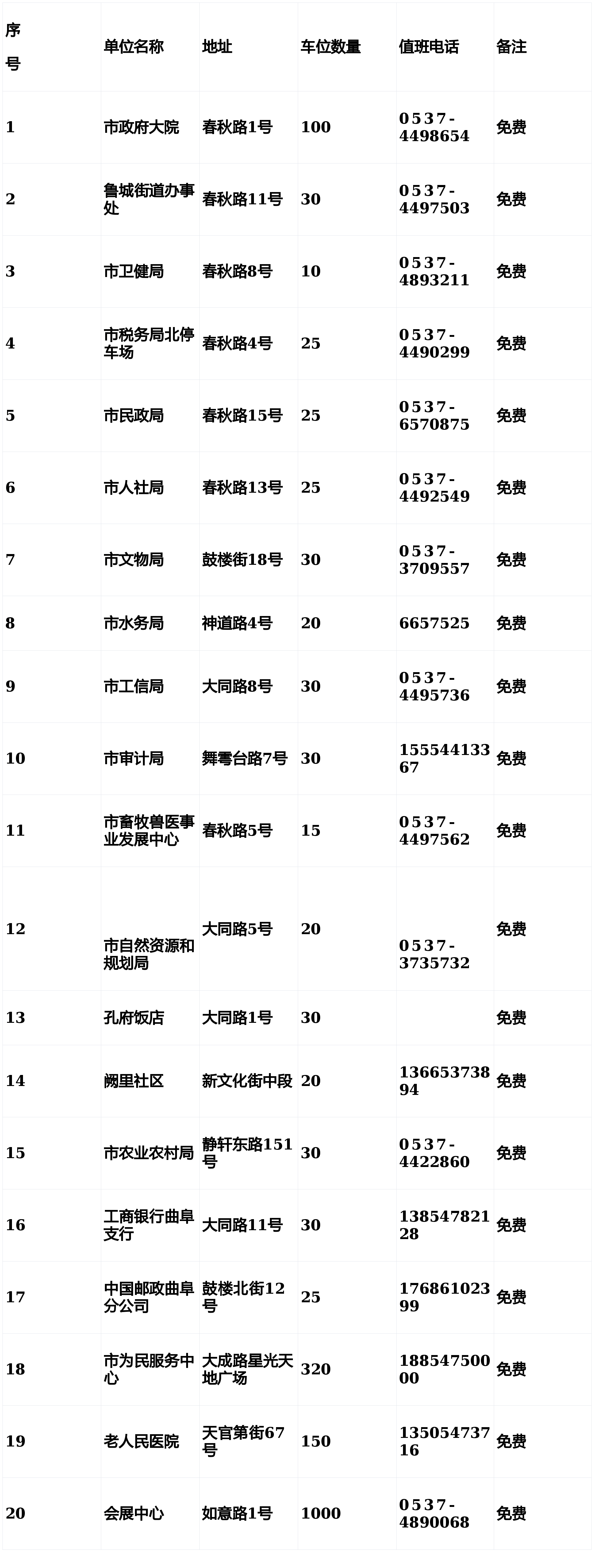 二、曲阜机关企事业单位内部停车场免费对外开放20家,可提供停车位1965个(错时开放时间:2月14日18:30—2月24日7:30)。
