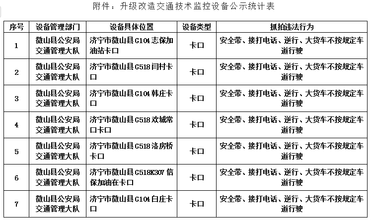 为维护道路交通秩序,保障交通参与者出行安全,依据《中华人民共和国道路交通安全法》及有关道路交通安全法律法规, 微山县公安局交通管理大队在辖区道路升级改造7处交通技术监控设备,现对改造升级设备予以公示,自公示之日起5个工作日后,将对有关交通违法行为依法管理。