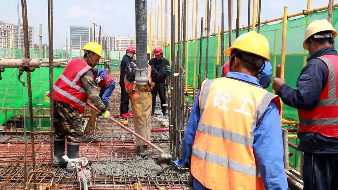 走进全民健身中心项目施工现场,塔吊挥舞着吊臂吊运钢筋、水泥等建材,工人们正有序进行混凝土浇筑作业。泵车长臂挥舞,混凝土倾泻而下,施工人员迅速跟进,确保浇筑均匀密实,现场一派繁忙景象。